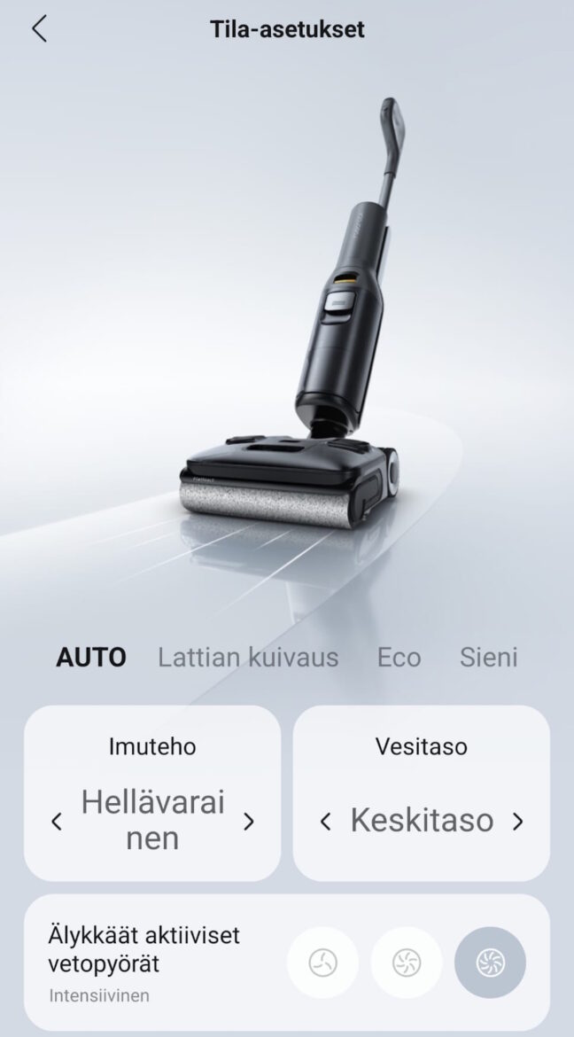 Ensinnäkin ACE on yhteensopiva Roborock-mobiilisovelluksen kanssa. Sovelluksessa voi säätää imutehoa, veden käyttömäärää sekä älykkäiden vetopyörien voimakkuutta (mieto, keskitaso, intensiivinen). Hallittavissa ovat myös itsepuhdistus- ja kuivausasetukset. Nämä ominaisuudet ovat erittäin käytännöllisiä: laite voi itsepuhdistua määrätyn aikataulun mukaan ja kuivauksen voi ajastaa hiljaiseksi silloin, kun nopea mutta kovaääninen kuivaus ei sovi tilanteeseen.