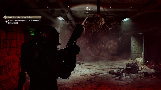 Taistelemaan joutuu tasaisin väliajoin. David Cronenbergin painajaisia muistuttavat kävelevät lihakasat ovat poikkeuksellisen kestävää sorttia ja tarjolla olevat hyökkäysvaihtoehdot todella kankeita. Alkuun käteen osuu vain palveluspistooli, jolla voi joko räiskiä nopeita mutta tehottomia heittolaukauksia, tai sitten ladata panokseen voimaa ja vapauttaa kerralla vähän suuremman määrän energiaa piipun suusta. Myöhemmin samaa asetta voidaan muokata toimimaan haulikon tai vaikkapa rynnäkkökiväärin tapaan. Panosten loppuessa on tyydyttävä lähitaisteluun. Hahmo osaa kyllä huitoa ja potkia, mutta molemmat liikkeistä on sen verran hitaita ja tehottomia, että niitä ei oikeastaan voi käyttää kuin hädän ollessa kaikkein suurimmillaan.