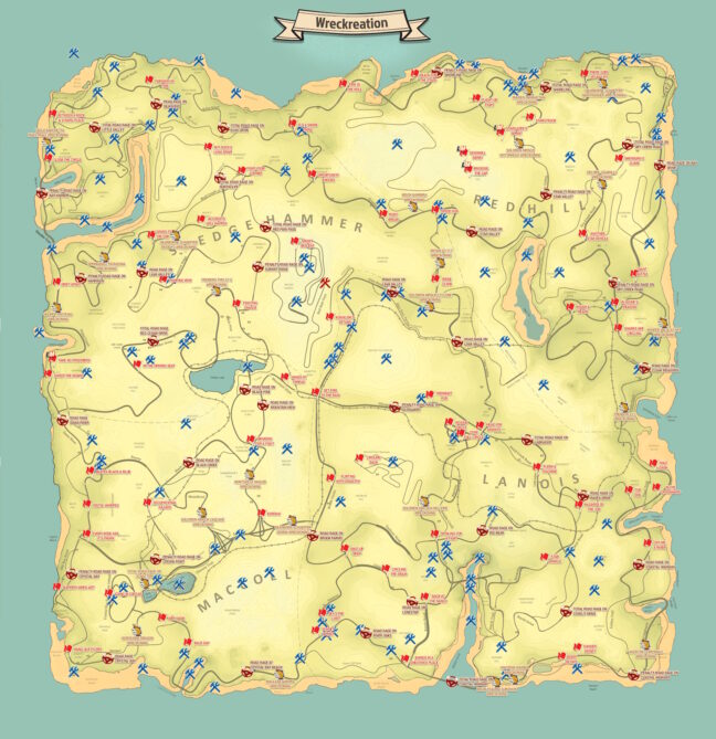 Jos olet kolaroinut aikanaan Burnouttien parissa, ei Wreckreation tuo mukanaan yllätyksiä. Tarjolla on kertakaikkisen valtaisa avoin maailma, joka suorastaan pursuaa erilaisia kilpailuja sekä kerättäviä elementtejä. Valtateiden sivustat pursuavat hyppyreitä, joiden avulla saa lennettyä erilaisten mainosplakaattien lävitse. Kylttien sekä rikottavien aitausten määrä on niin posketon, että mielenkiinto katoaa nopeasti. Kokonaisuus toimisi merkittävästi paremmin puolet pienemmässä pelimaailmassa, jossa jokaisella alueella olisi oma pointtinsa. Nykyisellään jopa 400 neliömetrin kokoiseksi lääniksi väitettyä kaahailutannerta latistaa tyhjyyden tunne. Baanat muistuttavat liiaksi toisiaan, eivätkä näiden väleillä olevat pelto- ja metsämaisemat tee menosta yhtään sen hauskempaa.