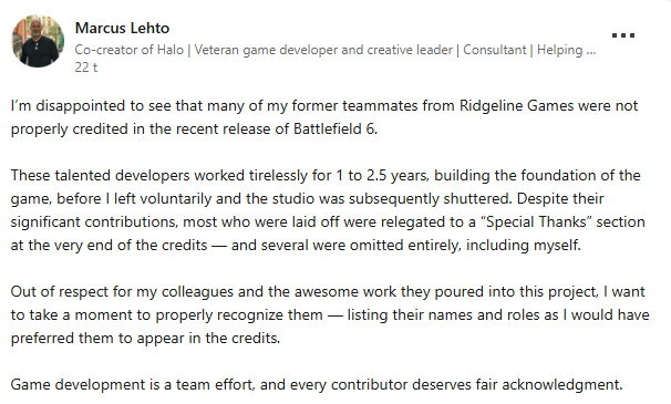 Lehto harmittelee, että kovasta työstä huolimatta läheskään kaikkia Ridgeline Gamesin aikaisia kollegoja ei Battlefield 6:n lopputeksteihin ole kelpuutettu. Osa mainitaan ilmeisesti erityiskiitosten alla, mutta esimerkiksi Lehto ei omaa tai monen muun merkittävän kehittäjän nimeä ole teksteistä löytänyt. Tuohtumuksen voi aistia Lehdon Linkedin-postauksesta, täältä.