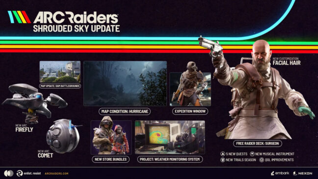 Embark Studios tuo Shrouded Sky -laajennuksella mukaan kuvioihin hurrikaanit, jotka vaikuttavat niin liikkumiseen kuin näkyvyyteenkin. Lisäksi tarjolla on uudenlaista keräiltävää sälää, parannuksia asetasapainoon ja parikin erilaista ARC-vihulaista, uutta Raider Deck -pakkaa unohtamatta. Se suurin uudistus on tietysti mahdollisuus lisätä omalle hahmolle naamakarvoja! Päivityksen sisällöstä voi lueskella tarkemmin täältä.
