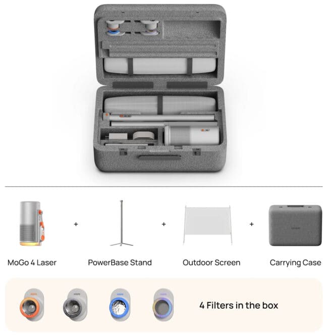 Outdoor Collection sisältää XGIMI MoGo 4 Laser -projektorin lisäksi kannettavan ja ulkokäyttöön soveltuvan valkokankaan tarvikkeineen, PowerBase-lisäjalustan ja neljä linssisuodinta tunnelmavalaistukseen.
