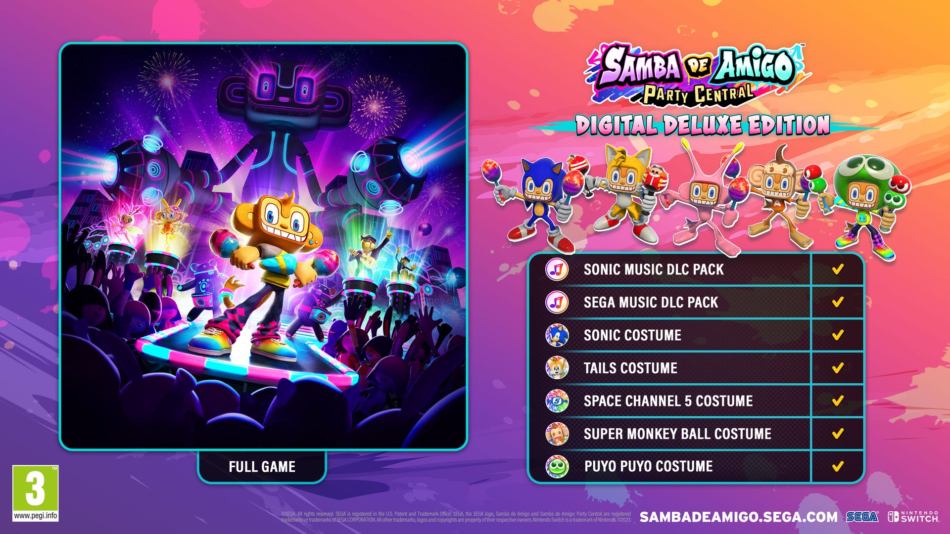 Samba de Amigo: Party Central jatkaa Dreamcastilta tutun edeltäjänsä jalanjäljissä, joskin marakassiohjainten virkaa toimittavat tätä nykyä Switchin Joy-Conit. Mukana on nelisenkymmentä eri biisiä, Digital Deluxe Editionin maustaessa soppaa vielä ylimääräisillä Sonic- ja Sega-musiikkipaketeilla ja ekstrakostyymeillä.
