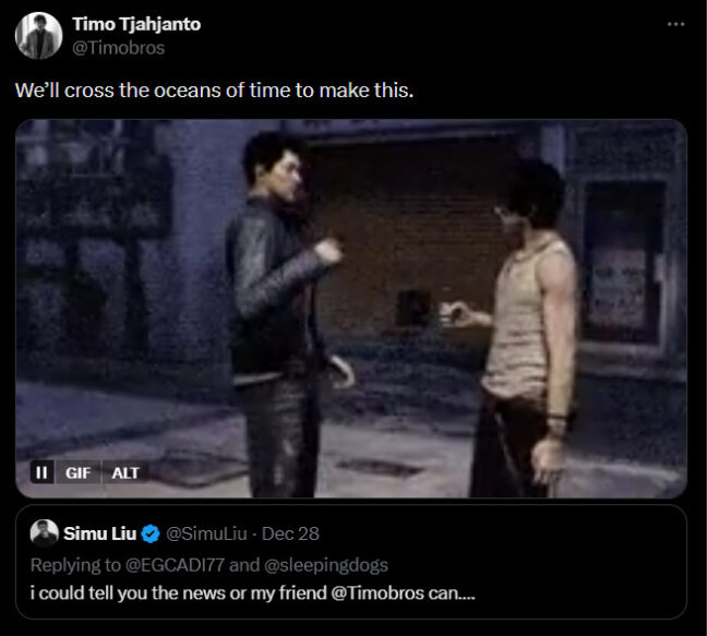 MCU-tähti Simu Liu paljasti taannoin olevansa mukana Sleeping Dogs -köörissä, ja nyt elokuvan peräsimeen on kiinnitetty jo ohjaajakin. Sleeping Dogsin rikostarinan tuo valkokankaalle Timo Tjahjanto, ohjaaja juuri ilmestyneen Nobody 2:n takaa ja V/H/S-elokuvien takaa. Asia selvisi niin Simu Liun kuin Tjahjantonkin X-tileiltä. Ilmestymisaikataulu ei ole tällä haavaa tiedossa.